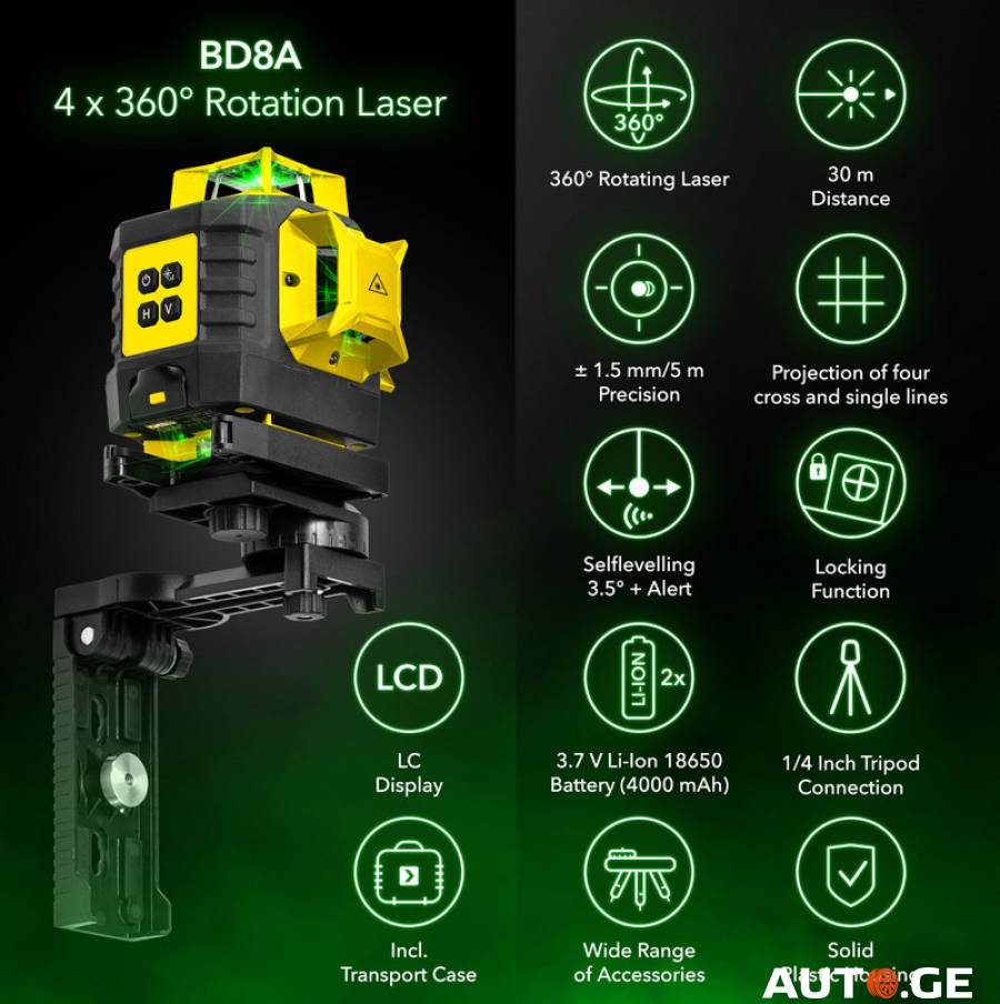 4 x 360° ჰორიზონტალური და ვერტიკალური ლაზერული ხაზების პროექცია შესანიშნავი ხილვადობით