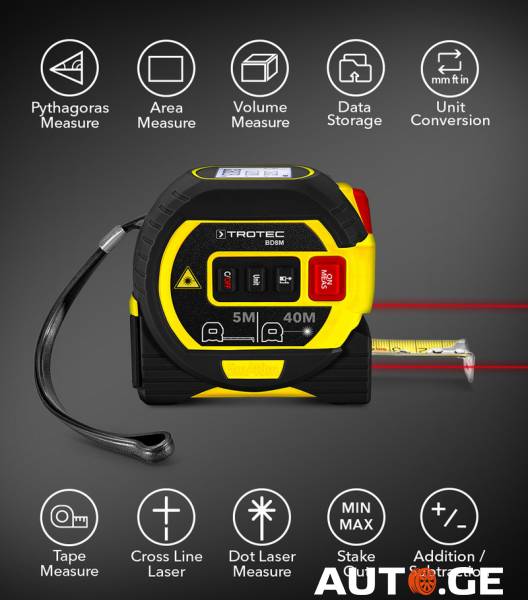 The compact multifunction measuring meter BD8M combines the functionality of three useful measuring instruments at the same time (laser distance meter, cross line laser, tape measure) and hence is recommended as mandatory equipment for both ambitious do-it-yourself enthusiasts and industrial users (e.g. architects, engineers, interior designers, craftsmen).