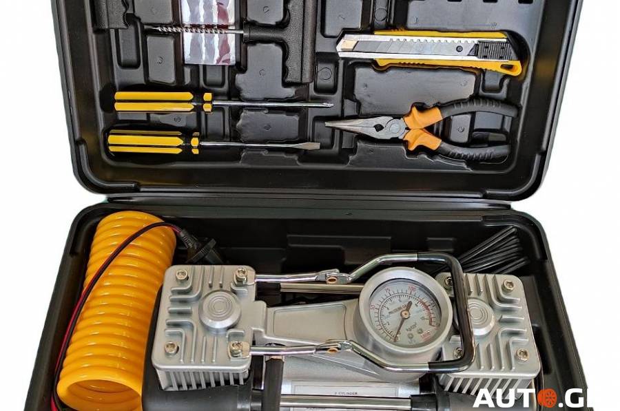 TECHNOKING გთავაზობთ - ახალი პრემიუმ ხარისხის ავტომობილის ძლიერი 2 ცილინდრიანი ელ. ნასოსი - კომპრესორი ხელსაწყოების ნაკრებით - სახლიდან გაუსვლელად და გარანტიით!