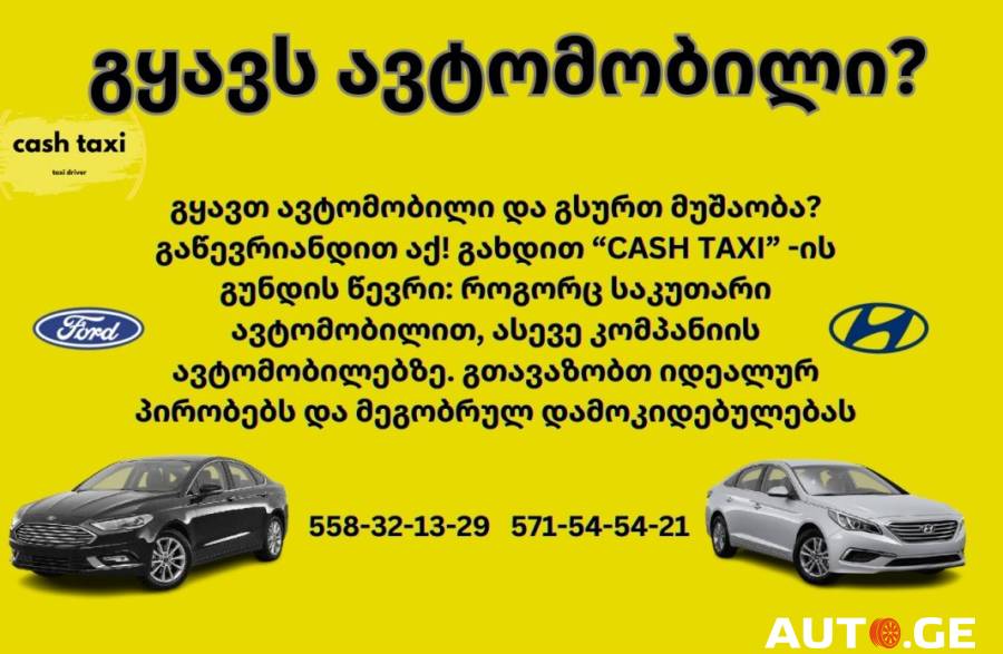 გყავთ ავტომობილი და გსურთ მუშაობა გაწევრიანდით აქ გახდით CASH TAXI -ის გუნდის წევრი როგორც საკუთარი ავტომობილით ასევე კომპანიის ავტომობილებზე იდეალური პირობებით და მეგობრული დამოკიდებულებით